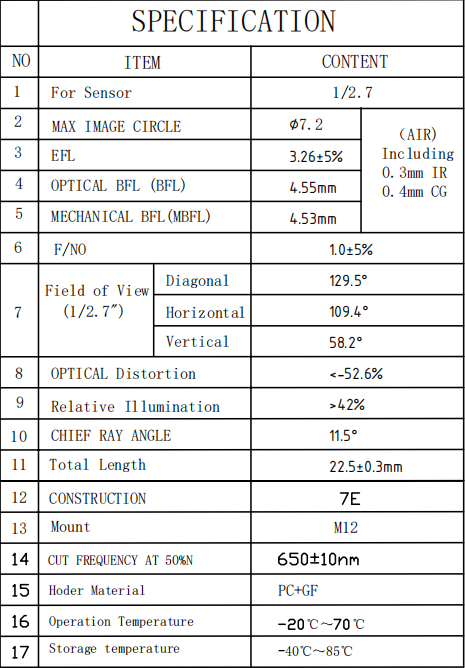 F1.0 3.26mm 1/2.7" 표준 M12 다크라이트 렌즈