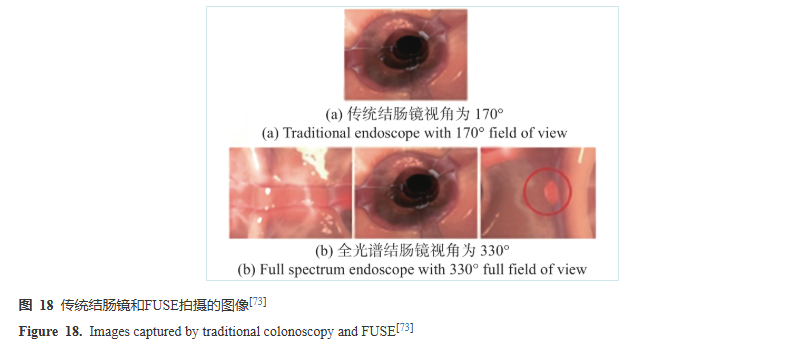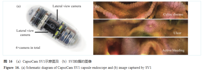 다른 캡슐 내시경과 달리 CapsoVision이 개발한 장치는 그림 16(a)와 같이 측벽 주위에 분산된 4개의 카메라를 통합합니다. 이 4대의 카메라에서 얻은 이미지를 연결하면 장의 360° 파노라마 영상을 얻을 수 있어 장 벽의 주름, 폴립 및 기타 병변을 관찰할 수 있는 탁월한 시야를 제공합니다. 통신 모듈, 배터리 수명 및 기타 기술이 지속적으로 개선됨에 따라 더 많은 카메라를 통합하고 더 나은 이미지 품질을 달성하는 것이 캡슐 내시경 개발의 주요 방향이 될 것입니다.