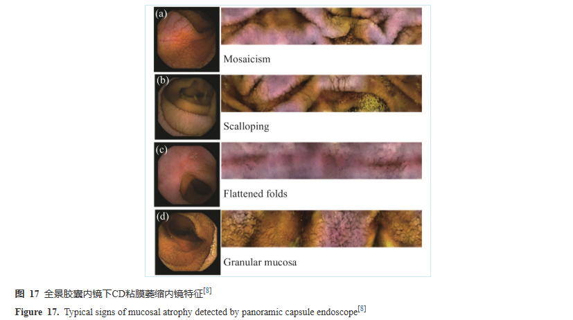 캡슐 내시경은 현재 광범위하게 사용되고 있으며 불분명한 위장 출혈(OGIB), 크론병, 복합 복강병과 같은 상태를 진단하고 치료하는 데 중요한 역할을 합니다. 그림 16(b)는 소아 지방변증, 궤양, 활동성 출혈 등 다양한 일반적인 상태에 대해 CapsoCam SV1으로 캡처한 이미지를 보여줍니다. OGIB 환자 153명을 대상으로 한 CapsoCam SV1과 PillCam SB3 간의 한 비교 연구에서 결과는 파노라마 뷰를 갖춘 SV1이 더 풍부한 병리학적 정보를 관찰하고 더 많은 출혈 사례를 감지할 수 있음을 보여주었습니다. 의사 만족도에 대해서는 캡슐 시스템 및 평가 소프트웨어에 대해 95%가 만족했으며, 치료 관련 이상사례/중대한 이상사례는 17.9%/1.3%로 나타났다. 전반적으로 SV1에 대한 환자 수용도는 높았으며 이는 외래 환자 환경에서 광범위한 적용 가능성을 나타냅니다. 파노라마 뷰 CapsoCam SV1을 사용하여 크론병 진단 및 관리에 있어 의사들은 크론병이 의심되는 환자의 원위 십이지장에서 회장 말단까지 수많은 미란 및 궤양을 관찰하여 병변 분류 및 감별 진단의 실질적인 개선을 시사했습니다. 이러한 소견을 토대로 환자는 광범위 소장 크론병을 진단받고, 구체적인 치료로 호전되었다. 셀리악병의 경우, SV1을 사용하여 소장 위축을 효과적으로 검출하여 조직학에 비해 우수한 민감도와 특이성을 나타냈습니다. 그림 17은 SV1으로 촬영한 CD 환자의 소장 부위 이미지를 보여줍니다. 이는 점막 위축의 4가지 내시경적 특징을 감지할 수 있어 CD 진단에 중요한 지침을 제공합니다.
